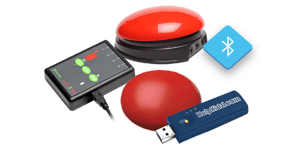 Bluetooth switches pair directly with devices like iPads, Android tablets, computers, and many Bluetooth-enabled AAC devices. Wireless adapters connect your existing switches to a device over Bluetooth. USB dongle bundles are ideal for fast, simple computer setups for switch activities. RF switches are wireless transmitters typically used with compatible receivers or systems.